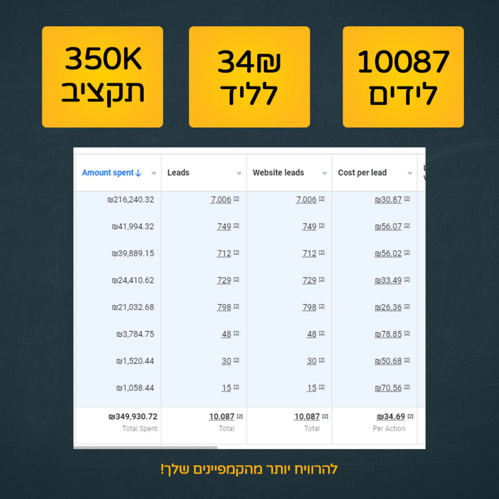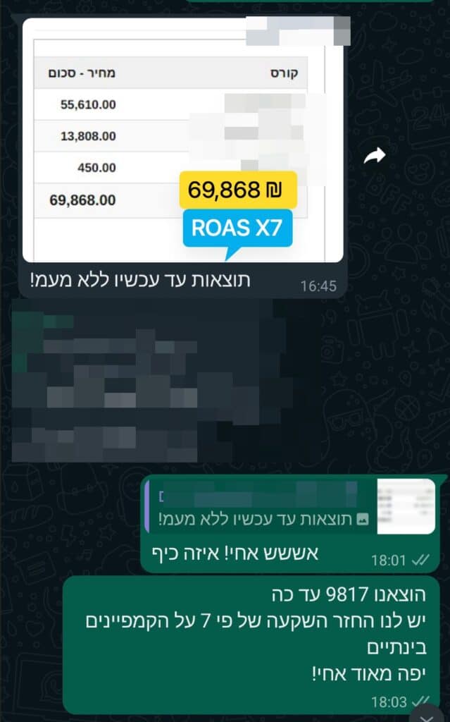 ובזכות העבודה המדוייקת הזאת הצלחנו להגיע לעלות לקוח שאנחנו רוצים להשיג וזה הדבר שהכי חשוב לי כמנכ"ל העסק.