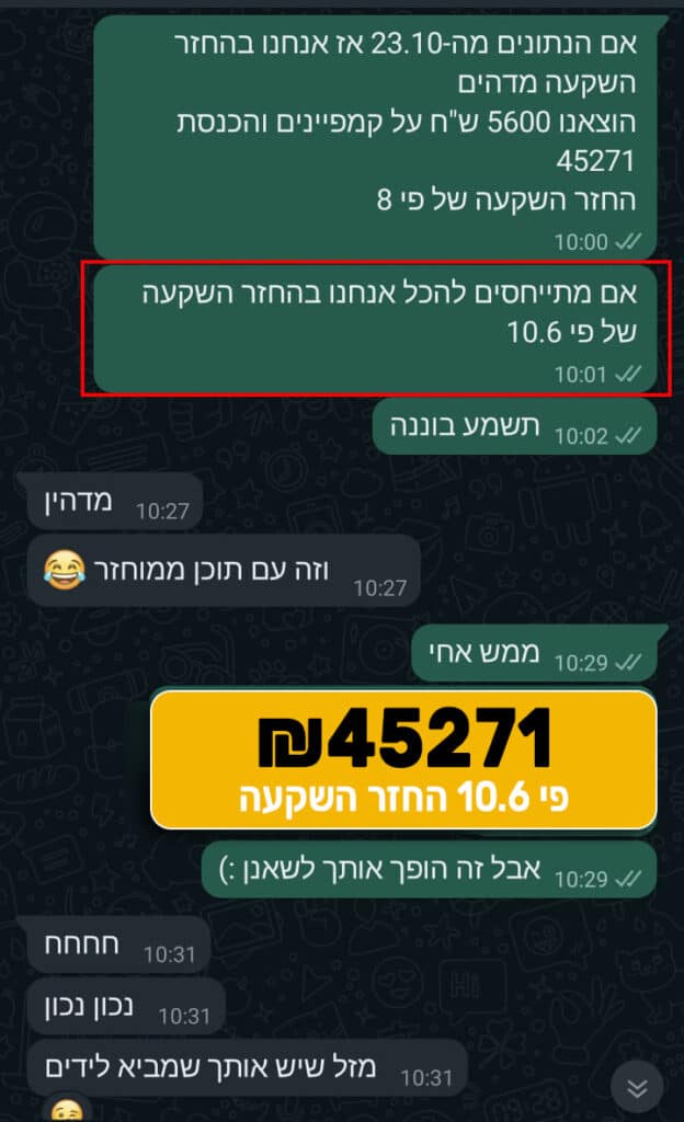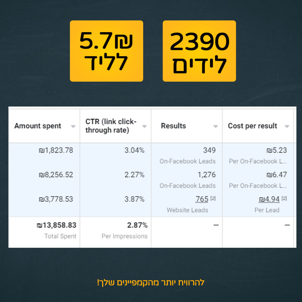 בקמפיין האחרון בפייסבוק השקעתי 16 אלף והכנסתי קרוב ל-60 אלף ש”ח בצורה יחסית קלה, מהירה על ידי פעולות מדויקות עם אסטרטגיה מדויקת וחיוך מדהים 🙂